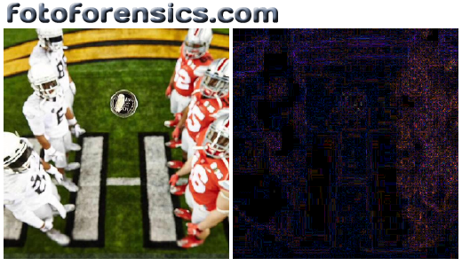 In contrast, other analysis methods identify that the coin was digitally added. For example, the coin is perfectly round -- it is perpendicular to the camera and has no motion blur. A real photo of a moving object (a flipping coin) should not be perfectly perpendicular to the lens and should have blending with the rest of the picture.